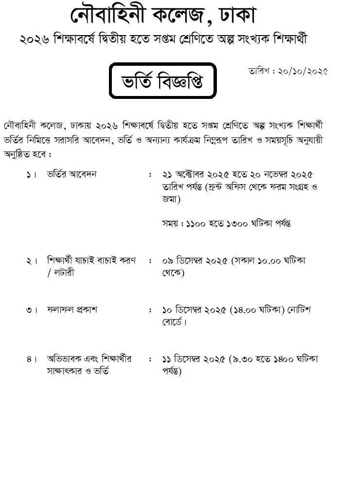 ২০২৬ শিক্ষাবর্ষে ২য় থেকে ৭ম শ্রেণিতে ভর্তি সংক্রান্ত বিজ্ঞপ্তি