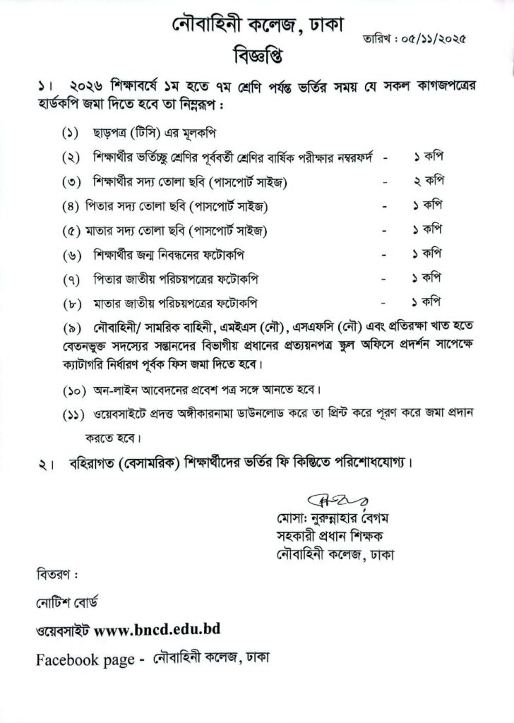 ১ম থেকে ৭ম শ্রেণি পর্যন্ত ভর্তির সময় প্রয়োজনীয় কাগজপত্র সংক্রান্ত বিজ্ঞপ্তি November 6, 2025 Admin Bncd