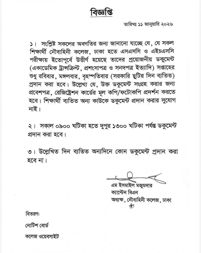 এসএসসি ও এইচএসসি পরীক্ষায় উত্তীর্ণ শিক্ষার্থীদের ডকুমেন্টস কলেজে এসে সংগ্রহ সংক্রান্ত বিজ্ঞপ্তি